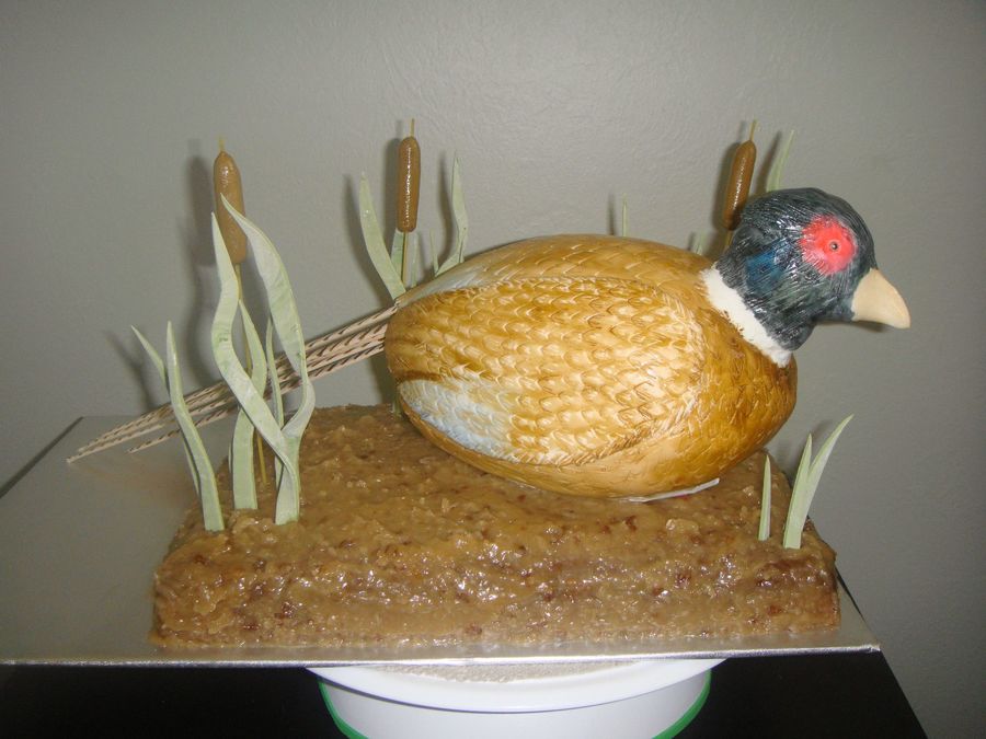 This was for a 24 year old's birthday, he is a huge pheasant hunter! The pheasant is red velvet cake covered in MMF then textured with a sharp knife. The bottom cake is german chocolate with coconut peacan frosting. The grass is gumpaste and cat tails are gumpaste wrapped around dry spaghetti. The pheasant tail feathers are gumpaste. The whole pheasant was painted with gel colors mixed with vodka. TFL