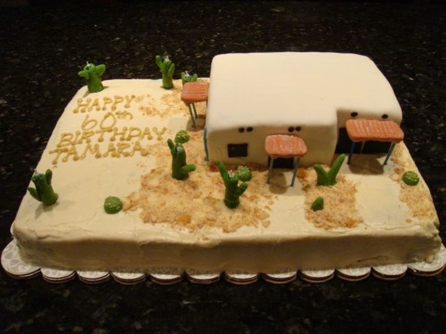 I made this for my boss' girlfriend's 60th birthday party. She has an adobe style house in Tucson. He gave me a couple of pictures to copy. The cake is 2 layers of 12 x 18 carrot cake with cream cheese frosting. The house is RKT covered in fondant. The cacti are fondant. Some of them have candles in them. The sand is crushed up nilla wafer. Thanks for looking