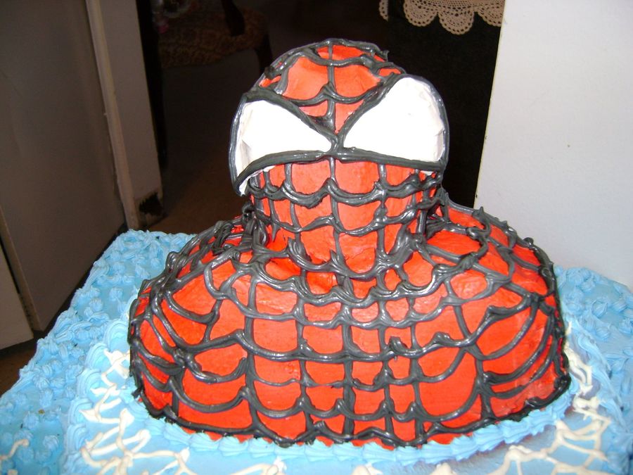 i make this cake for my grandson carlitos,on his 6th birthday,he love spidermar,i used one round mold,and i carved i placed stand up,the head was make with rice crispy, for the masc.i used fondant,and i cover with butter cream,filling used vanilla cream/all kids was happy/