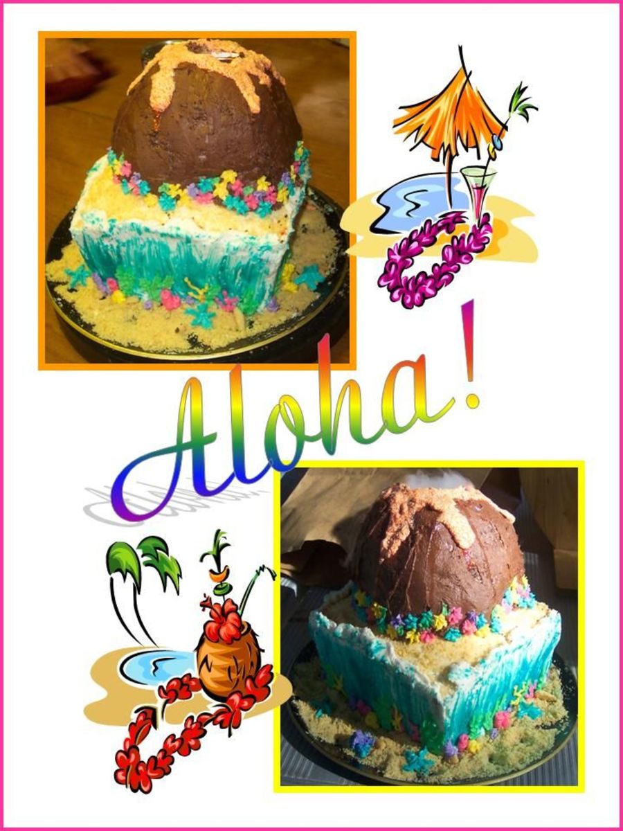 I made this cake for my daughter's 12th Bday. The image in my head didn't translate as well, but I know what to do in the future. The volcano, (which we put a yogurt cup in to hold the dry ice effect that you can see somewhat in the bottom picture :)) looks more like a coconut than a volcano, but next time, I will make it a little more proportionate to the bottom cake :) All BC white cake swirled blue to mimic waves inside :) The "waves" on the sides are painted with watered down food coloring paste and a large brush to make it look like waves- the white parts on the top are supposed to look like where it crashed on the shore :) The picture doesn't show it as well :)The bottom is also carved at an angle, but that isn't very evident in the picture either... It was fun though- TFL :)