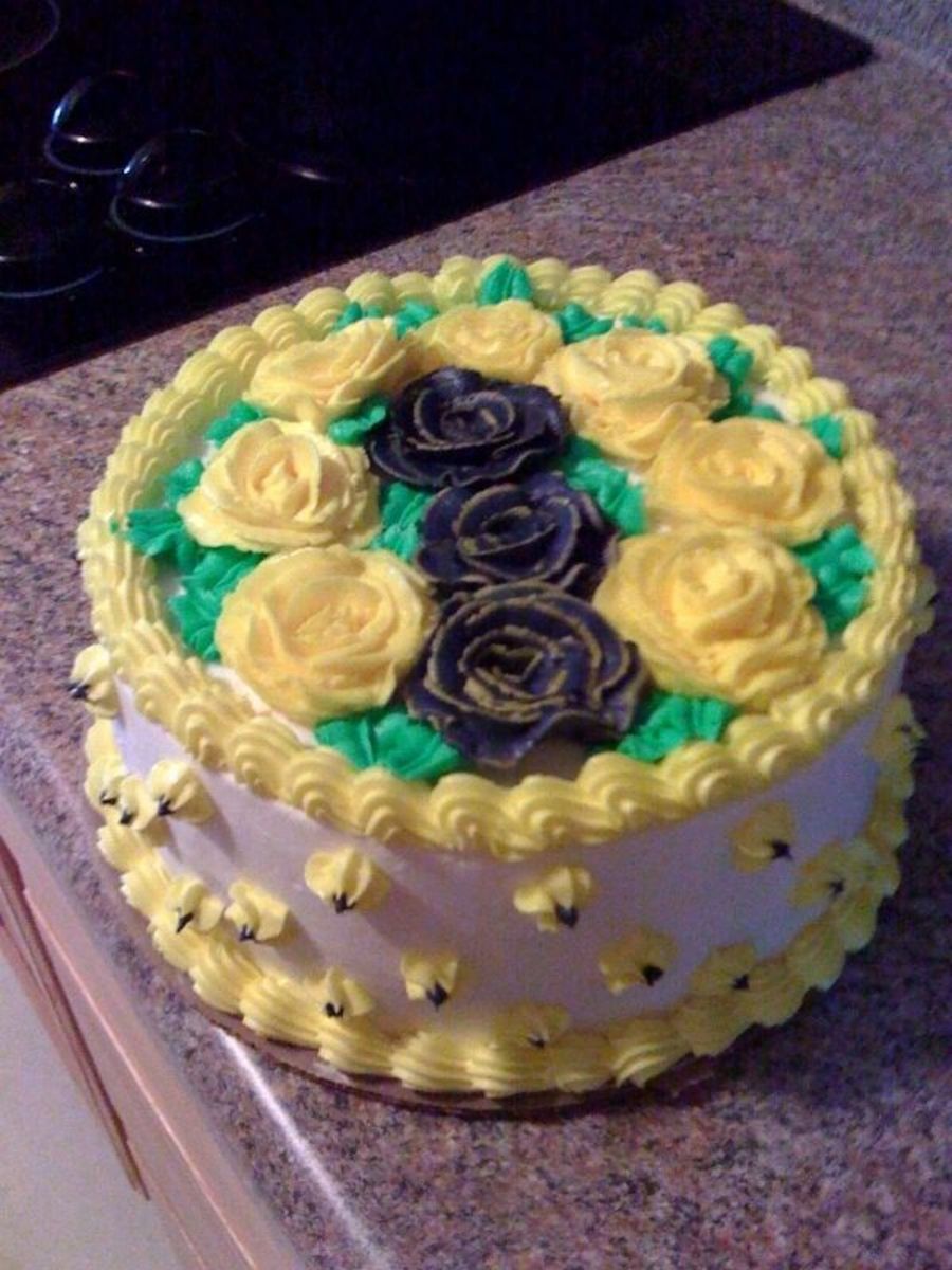 White cake, blue and yellow buttercream roses
