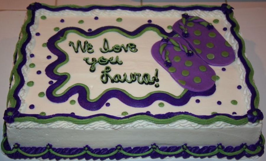 buttercream 9 x 13 sheet cake with fondant flip flops thanks to cakery for the idea.:)