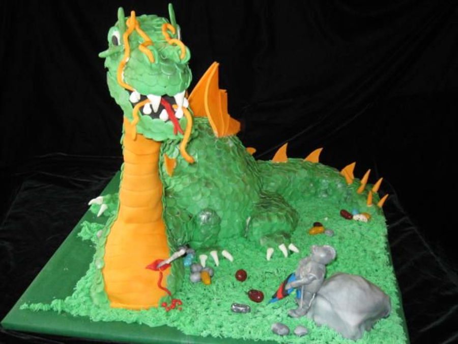 Well, I finally did this cake. What a labor of love. This was for my 5 years old son, and he was the happiest kid in the planet. I was planning to make more things like trees but I run out of time and I was so tired that I thought it look OK this way. Head is styrofoam, neck is rice krispies, rest is cake. I have learn so many things with this one, Big THANKS to DianeLM, without your help I do think I could make it.