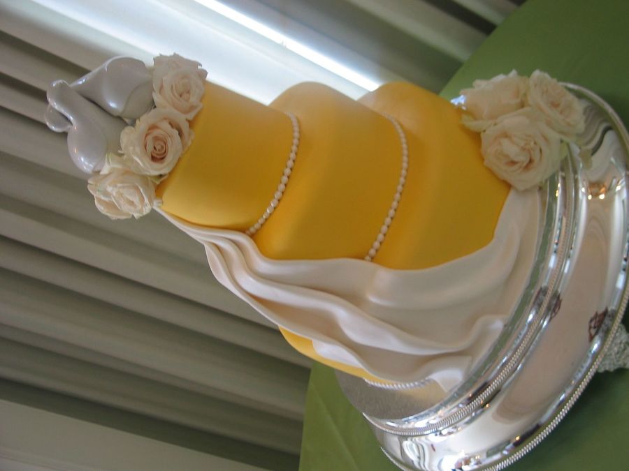 Uggh...this wedding cake was tough from beginning to end, but finally got it worked out at the end. Mango curd leaking, fondant tearing, trouble with fitting topper and flowers....fingers crossed that it stayed like that! Yellow butter cake with cognac buttercream and mango curd...mango curd in the interior matched exterior fondant. Fresh flowers and topper provided by the bride.