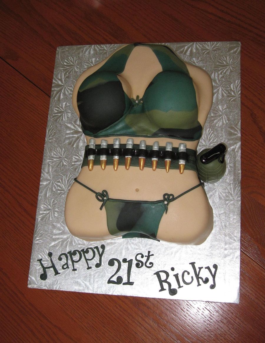 A cake for my nephew's 21st birthday. Since he's in the Canadian Forces reserves, she had to wear a camo bikini complete with gunbelt and grenade. ;-)