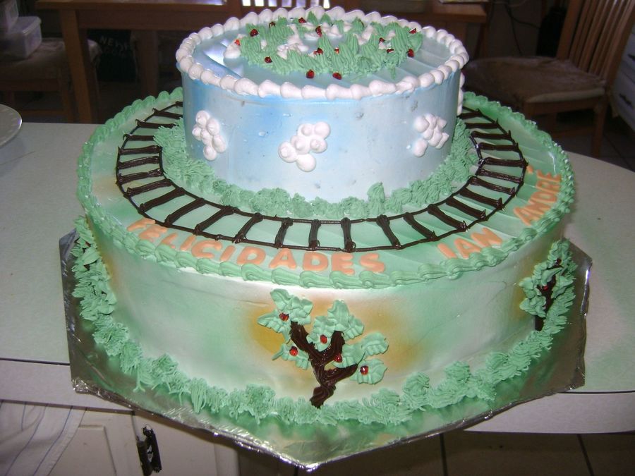 Este pastel decorado enteramente en crema, llevaria un tren del Tomas en la parte de arriba y uno de sus amigos en los rieles, serian colocados en la recepcion.