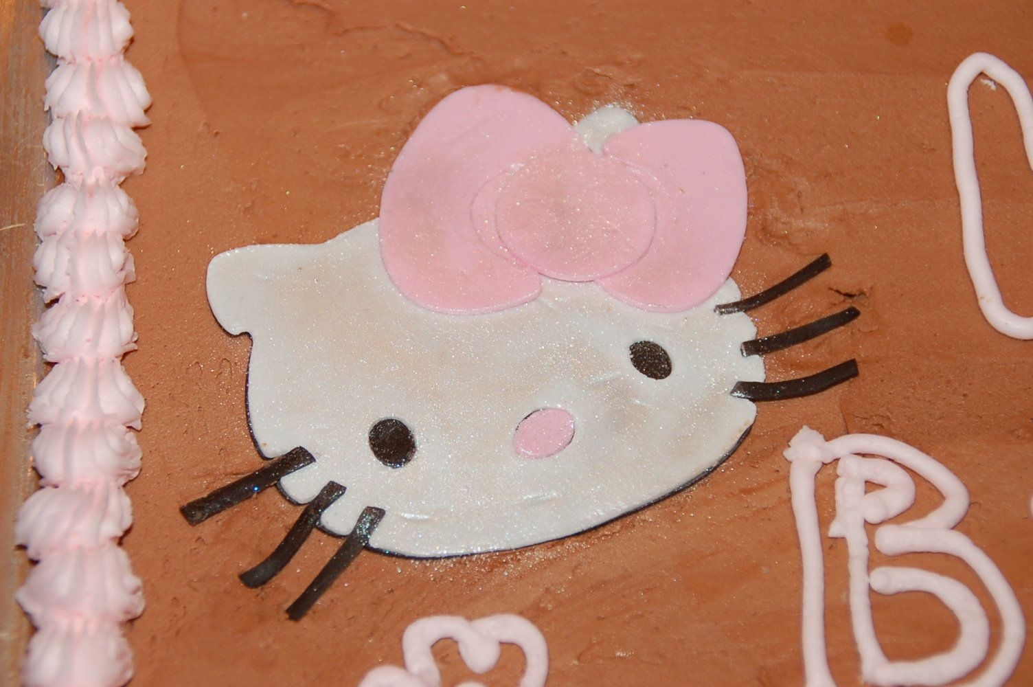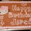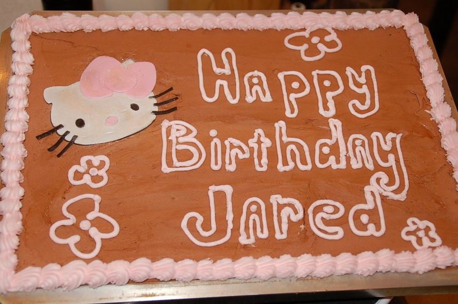 This cake was for a guy in my office that loves Hello Kitty. The cake is a doctored German Chocolate mix w/BC icing. The Hello Kitty figure was cut on my Cricut Expression out of fondx with a touch of Tylose.
