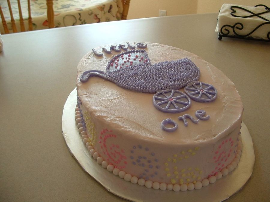 Did this for my first ordered cake, she liked the one in the new Wilton 2010 yearbook but wanted butter cream and pink and purple for the colors. I carriage was a FBCT, but cracked so ended up doing the dots all over the top. My swirls on the side aren't great but okay. Thanks for looking.