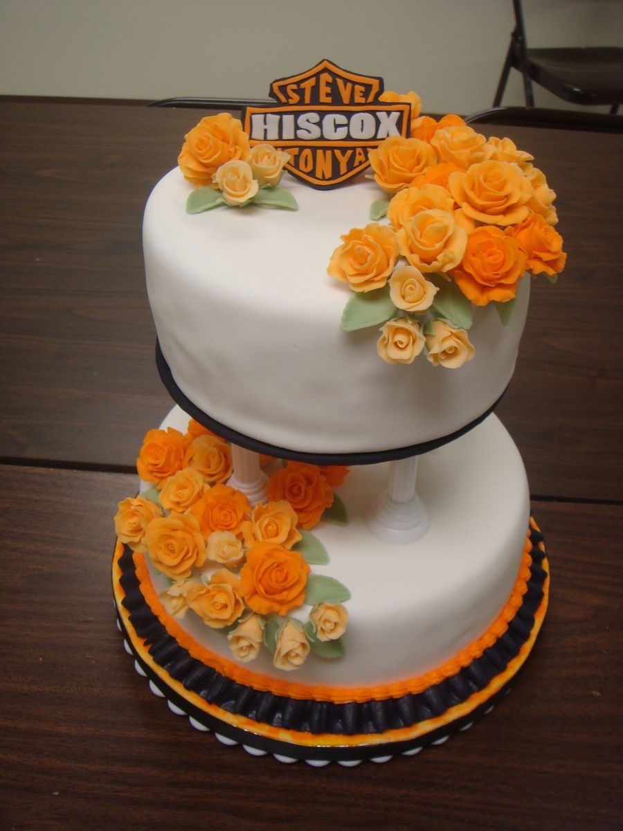 My first tiered cake. I learned I should have made a 6" cake to put on the cake plate that came with the wilton course 3 cake. I think the cake would have looked much better with the ruffle on the top tier also. Live and learn right? I am still trying to learn how to make the cake completely smooth. Logo, flowers, & leaves made with fondant. Cake & board/plate covered in fondant. Lace & shell made with buttercream.