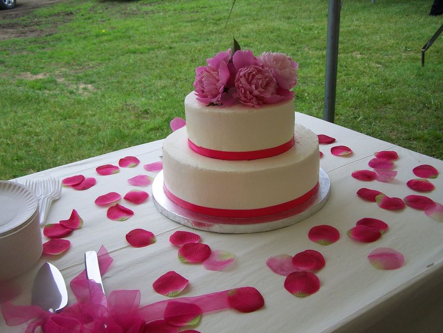 Surprised her wedding guests with a flavor combination: Banana cake with Raspberry filling and iced with vanilla buttercream, Flowers were grown by the bride, and the ribbon matched her bouquets.