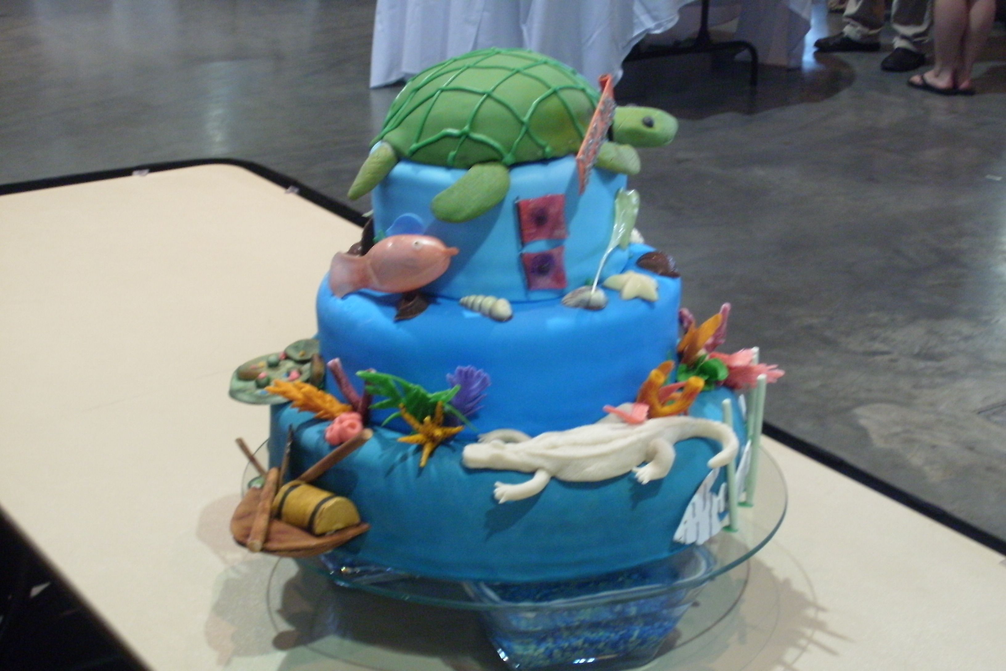 Local cake competition - had to be at least three tiers, theme was NC tourist attractions, had 2 hours to curve, ice, and decorate, decorations could be made ahead of time. My theme was the 3 NC aquariums - each has a different themes, so each tier represents each one. Turtle was curved on site.