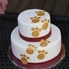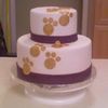 The cake I made for my class reunion. Both tiers are chocolate WASC with chocolate ganache and raspberry filling, covered in fondant with fondant decorations. Pawprints are brushed with gold pearl dust. This is my first tiered cake.