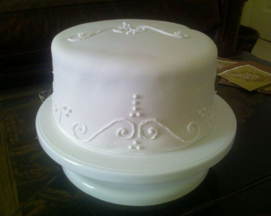 WASC iced with white chocolate ganache, covered in fondant with RI piping. This was a practice cake - I just wanted to test the flavors. But after my unfortunate potholder/cooling rack incident, it also qualifies as a disaster! The top layer is split and broken in about 5 pieces and patched back up with ganache. I'd never piped with RI before this, but it seemed like a good time to try it.