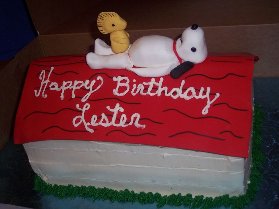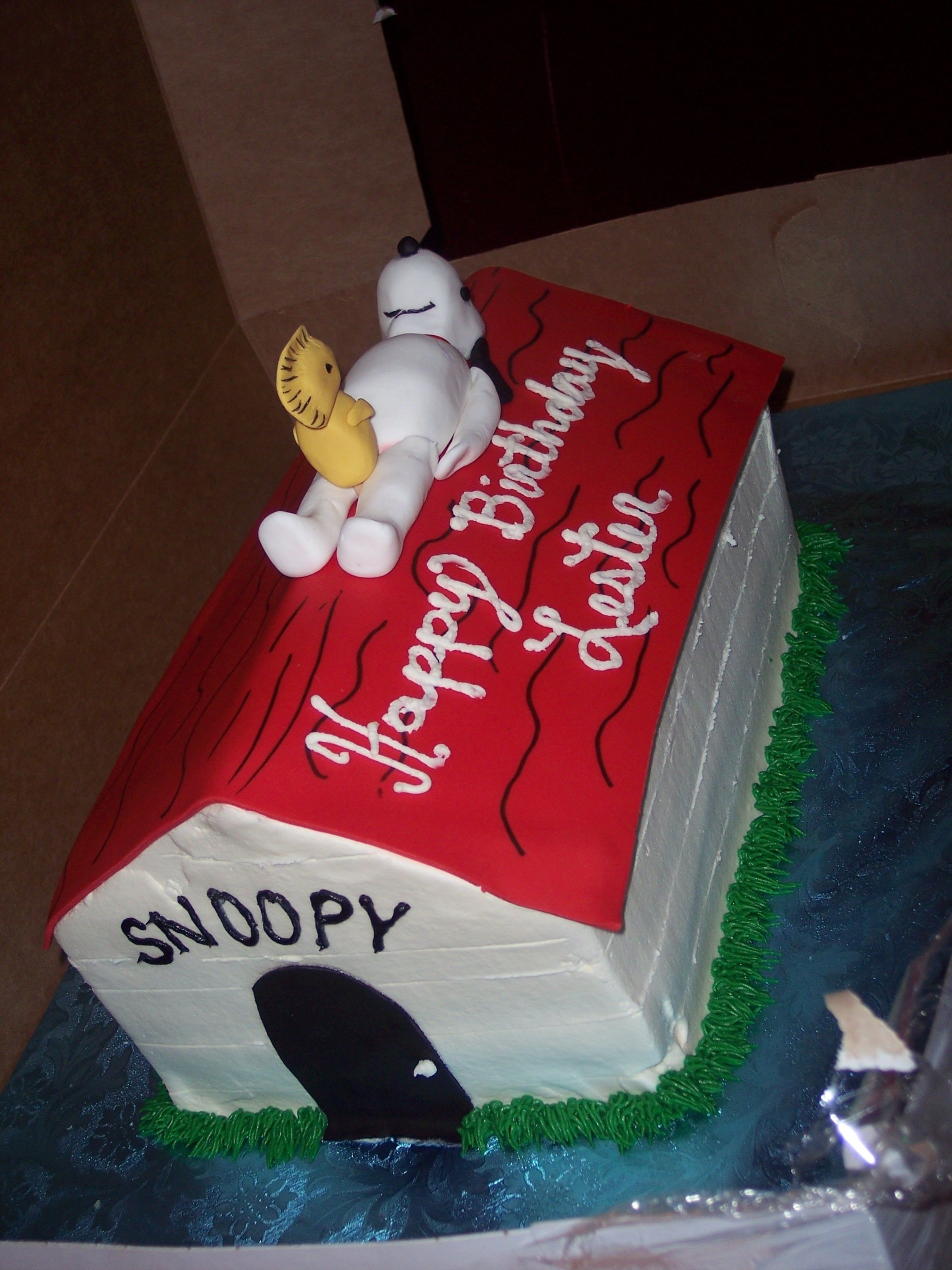 This cake was done for my husband's birthday. He has always loved Snoopy. I took it to his job and all of the guys loved it and he only camp back with the box. Snoopy Woodstock and the roof are fondant, everything else is buttercream.