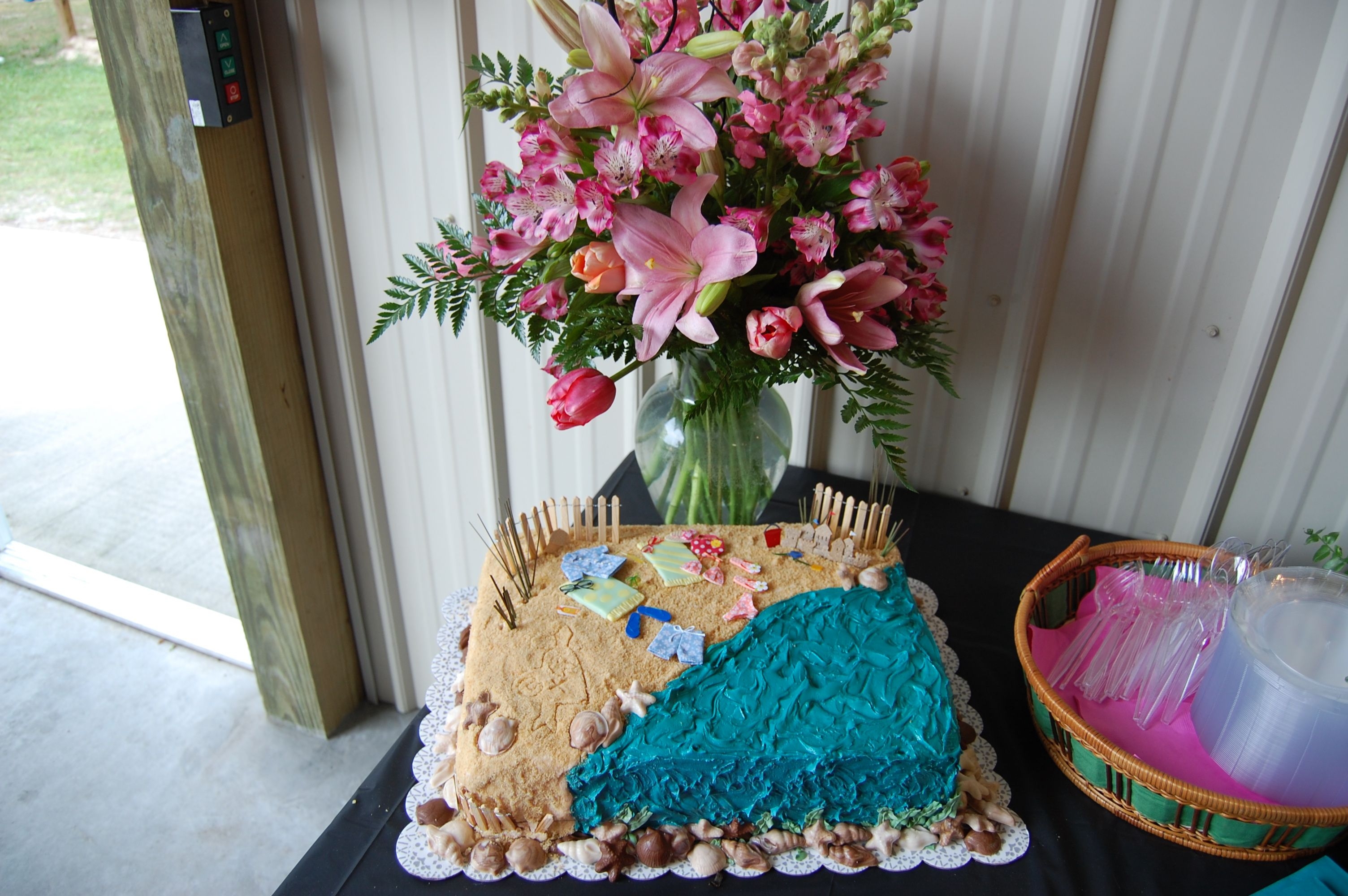 11x15 french vanilla with pineapple buttercream filling. Ground up sugar cookies for sand. Was short on time, cheated with decorations on top - used beach themed scrapbooking stickers! Just the touch if you're in a pinch! :)