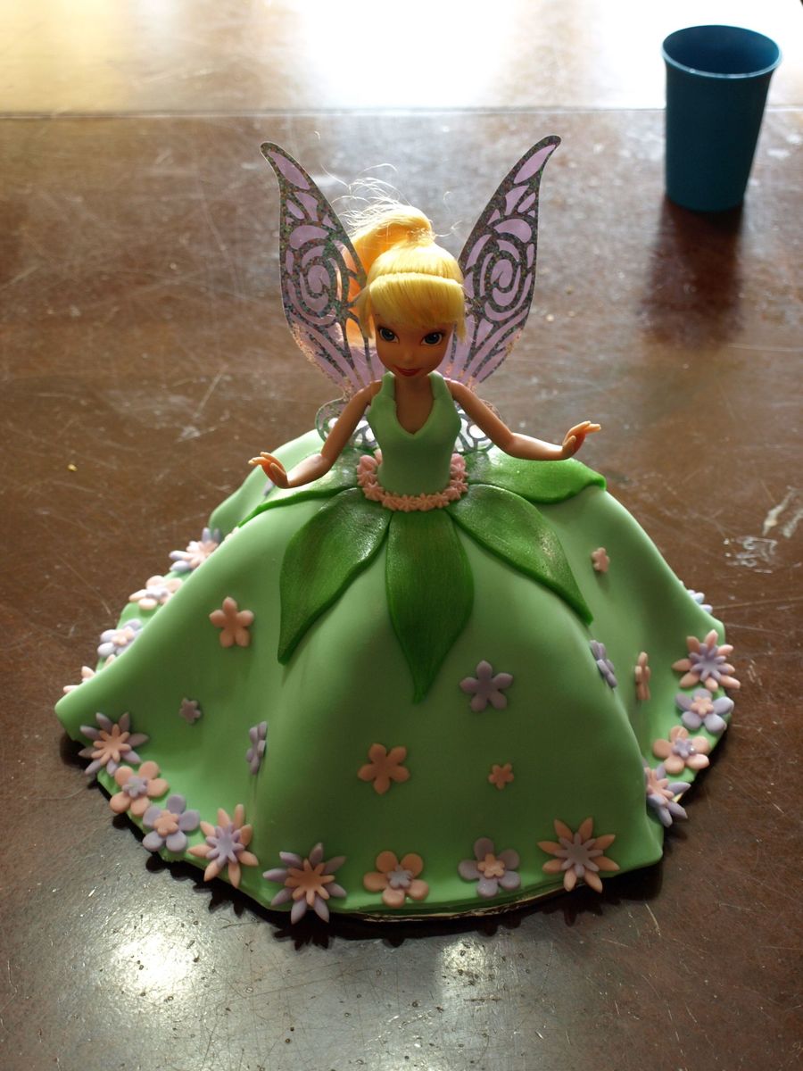 This was a birthday cake for my 9yo daughter. Funfetti cake with Tinkerbell doll. The dress, leaves and flowers are fondant. The inspiration came from another member.