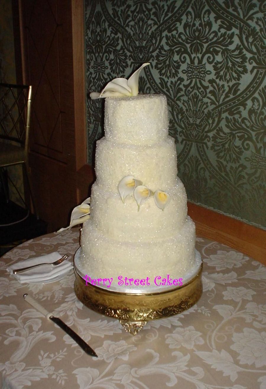 I did a much smaller cake using sugar crystals like this, and I remember what all I had to do to get the little boogers to stick, so I am truly impressed at a cake this size COVERED in those crystals... KUDOS!