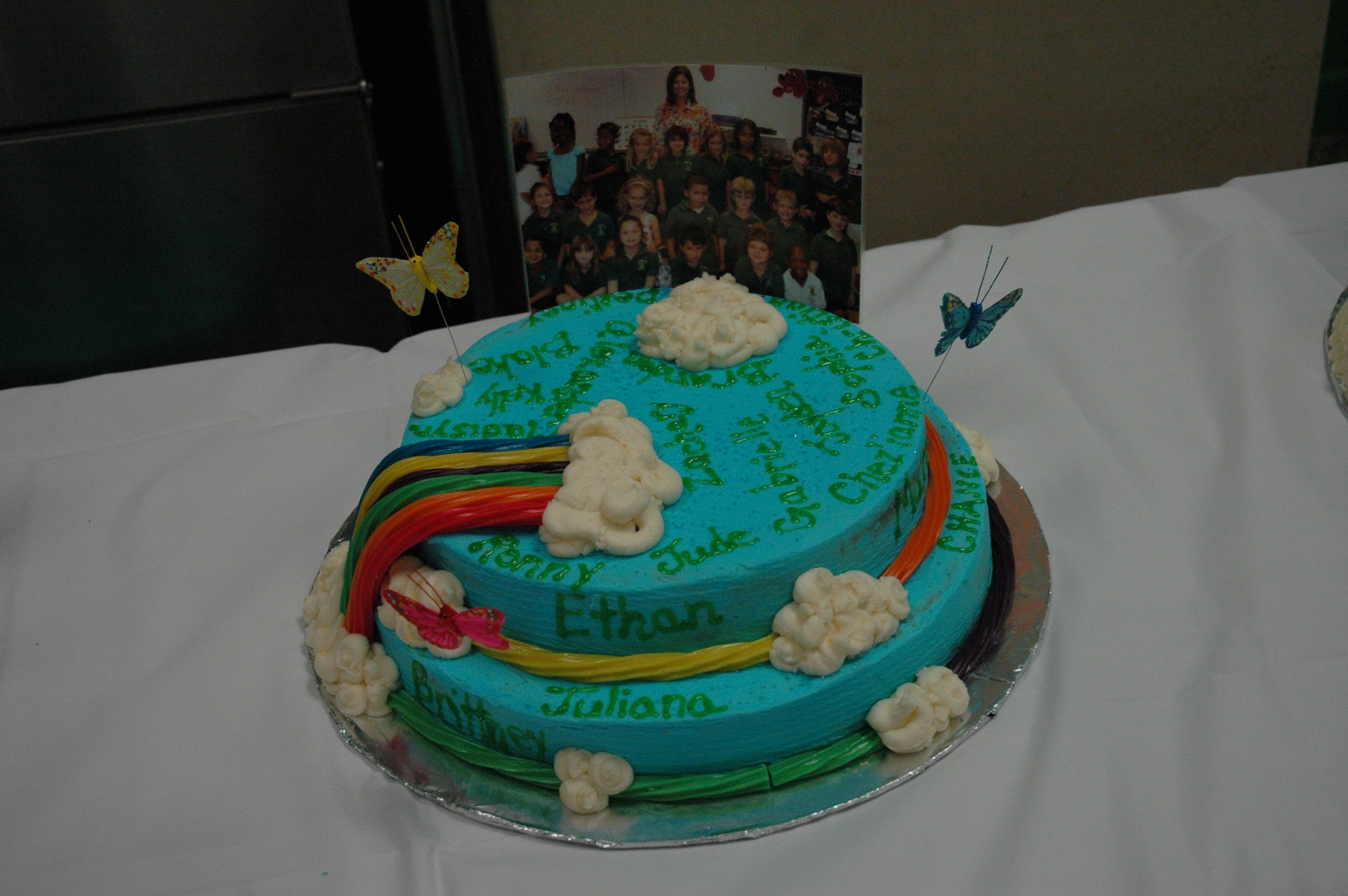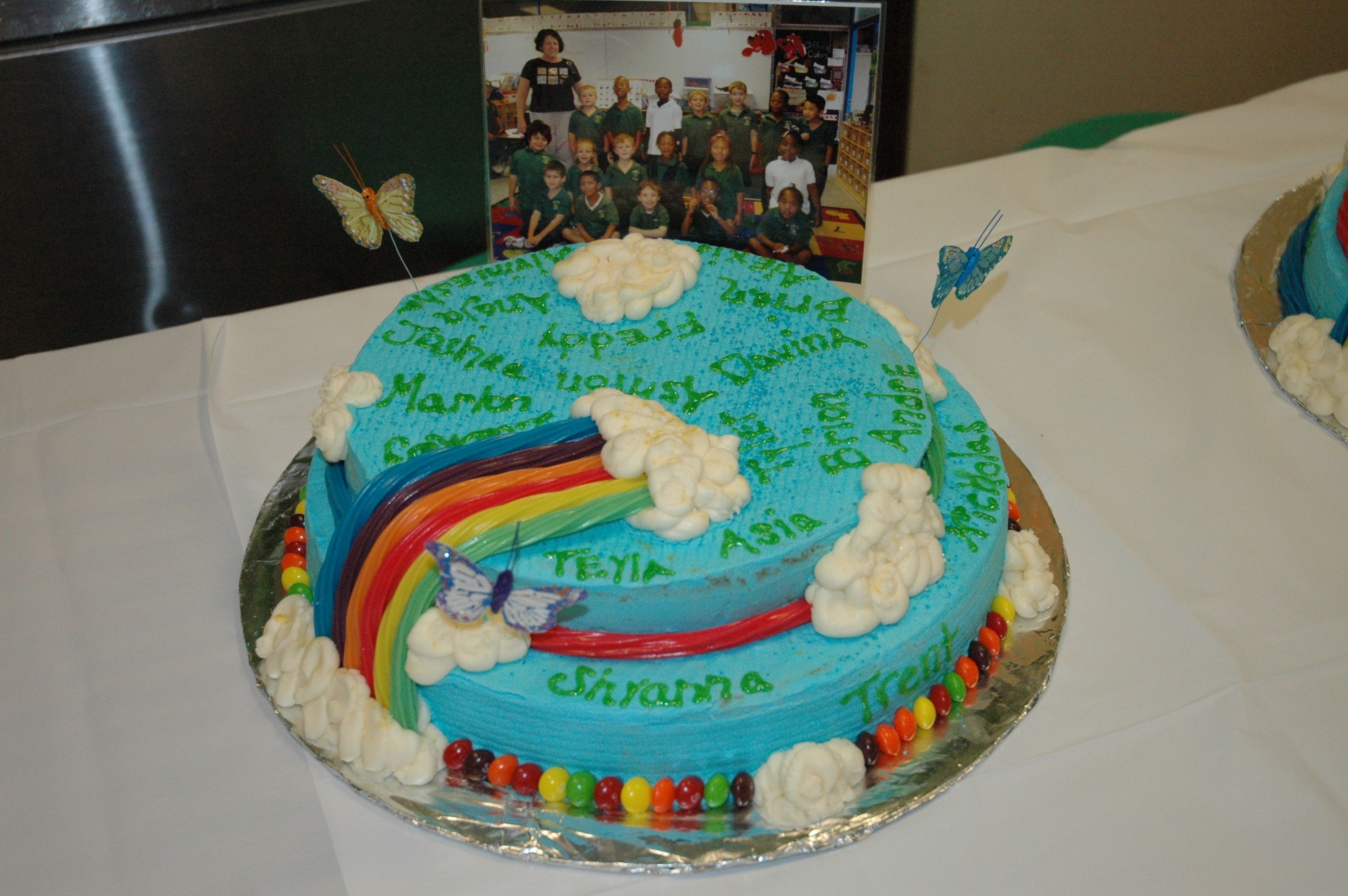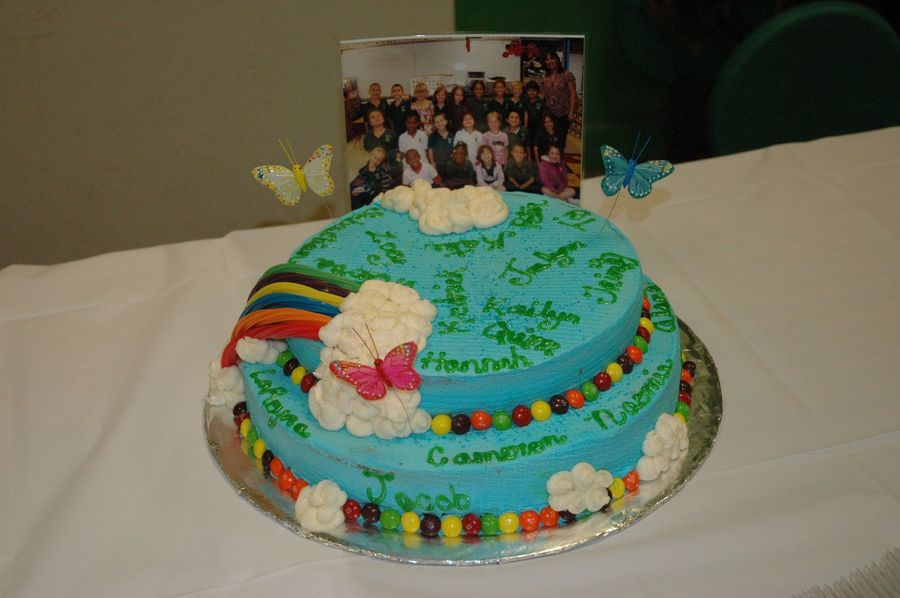 i made 3 different flavored cakes, one for each class. I did them in buttercream and then used the papertowel method for the pattern. i had a picture of each class, and the kids names written on there cakes. i used twislers and skittles for the rainbow effect.