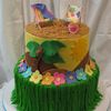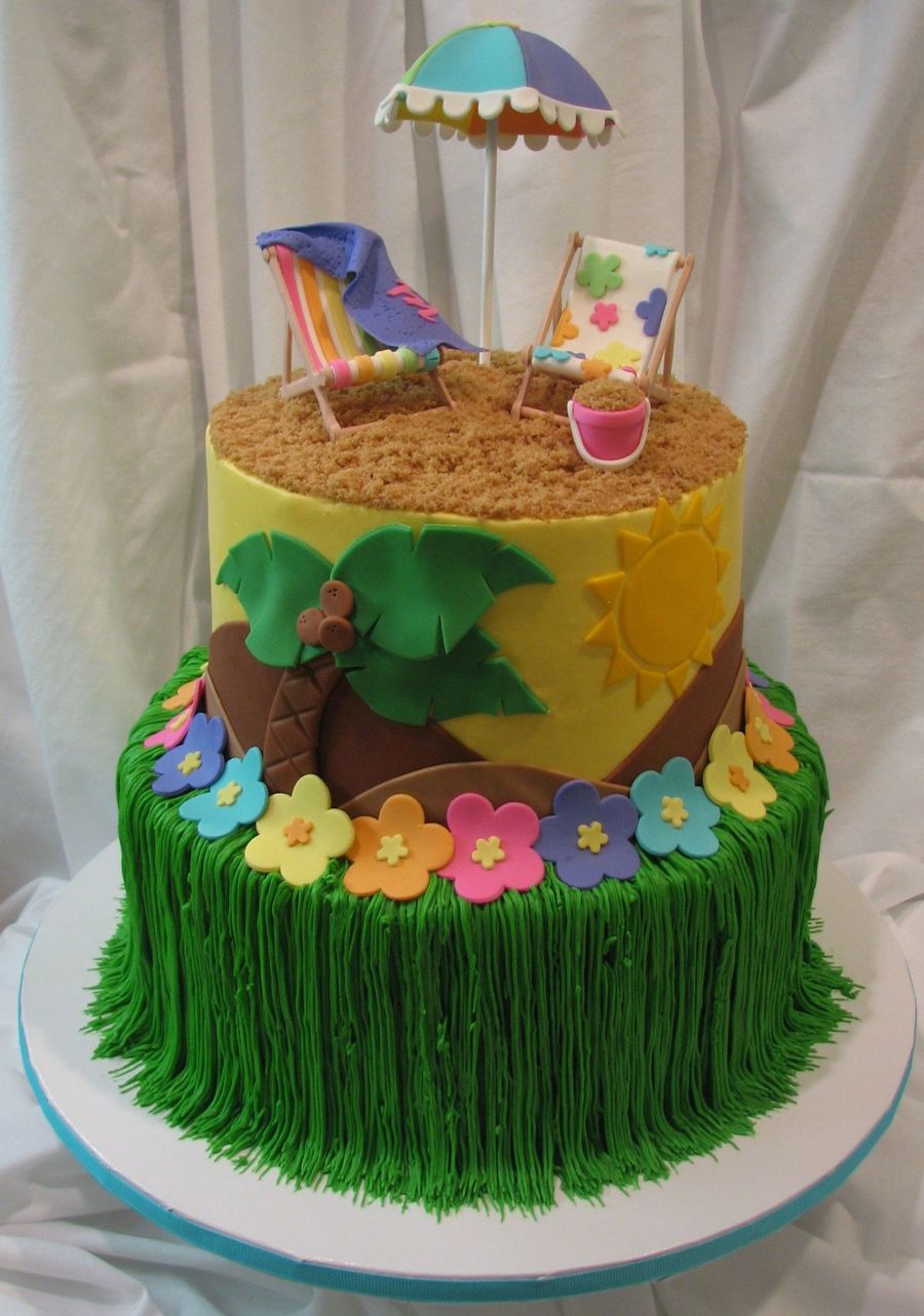 This cake was done for a little girls backyard Luau themed birthday party. The cake is done in buttercream with fondant accents. The "grass skirt" was piped with buttercream with fondant flower accents. The beach umbrella, chairs and sand pail were done in gumpaste. The "sand" is brown sugar.