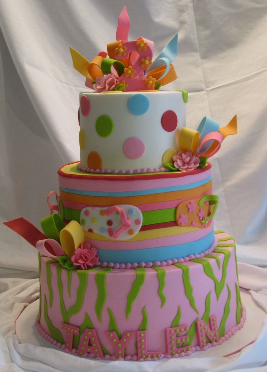 Cake I did for a little girls second birthday with a flip flop/swim theme party. The cake is done in buttercream with fondant accents. The stripes on the second tier, the zebra stripes, the polka dots and the flip flops are all done in fondant. The bow loops, the "2" and letters are done in gumpaste.