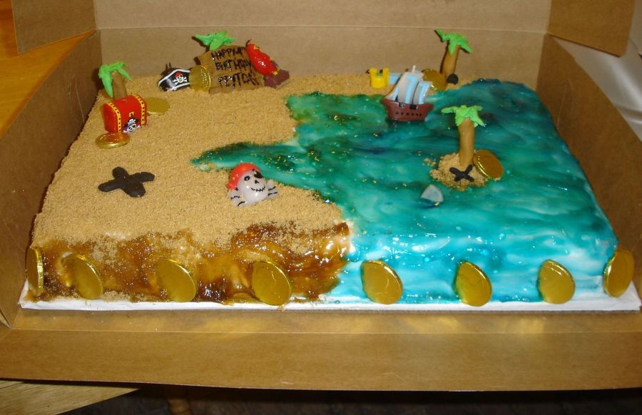 nephews pirate themed bday cake.. gel for the water. brown sugar for the sand.. boy this is going to be super sweet haha.. and fondant trees.. candles for the decor!!!
