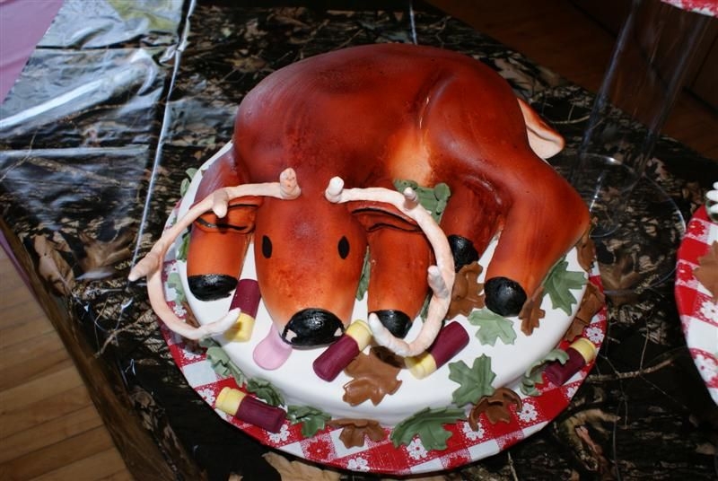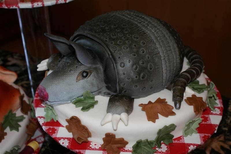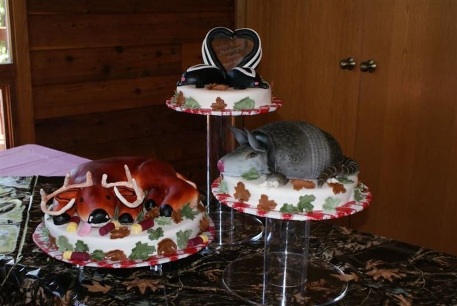 This was a specific request by the bride. Top tier is skunks (made out of rice krispies), 2nd tier armadillo is red velvet, bottom tier whitetail buck is red velvet for the body and rice krispies arms and head. TFL!!!