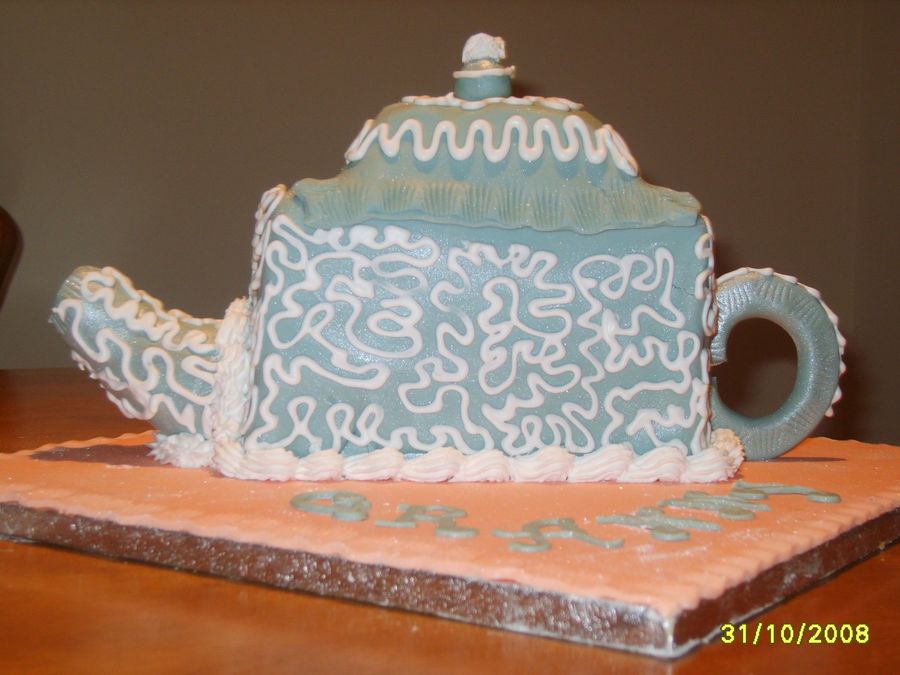 Fondant covered teapot with gumpaste spout and handle. My mum is mad about teapots so i gave this a bash the RI was added purely to practise using a piping bag at an angle piping is my nemesis !