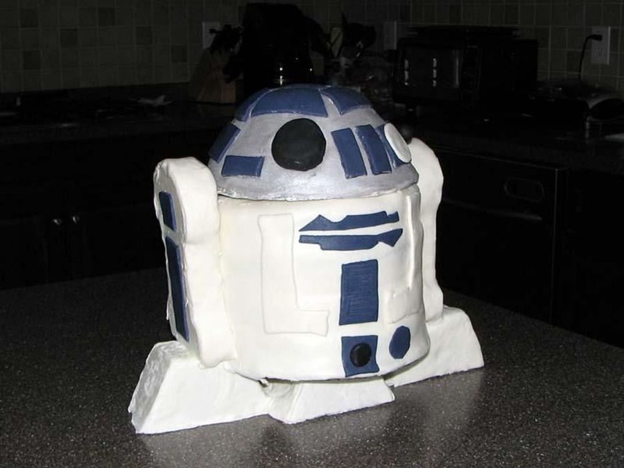 My son wanted a 3D R2D2 cake for his last day of school. My first attempt at creating a shaped cake like this. Decorated completely in fondant.