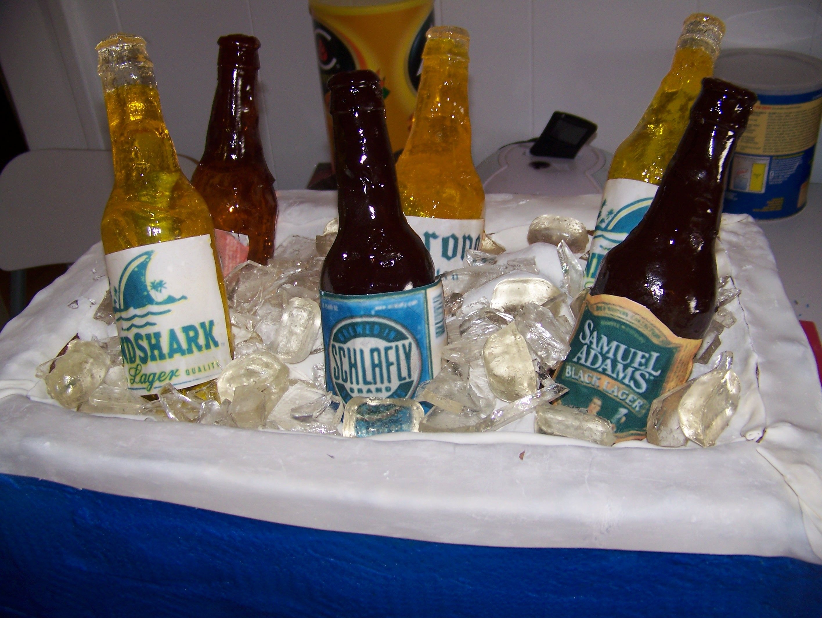 i was very busy this week but being i had a big BBQ to go to and i can never go anywhere without a cake! and i was dieing to do sugar bottles so this was a perfect excuse. i would have mDE nicer wood bucket but i didnt think i had the time, so i make 4 layers tall WASC and chocolate guinness cake filled with chocolate guinness butter cream. i love love love the bottles i made the mold following the tutorial i think i need to make them again because they werent parfect and i think the next one will be alot better. if your looking at this and saying i cant do this yes you can it takes some time to make the mold cause of drying but you can do it!!!!