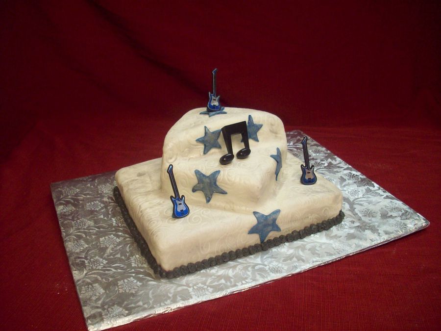 This cake was actually for a baby shower. It is covered in fondant with pearl dust. The notes and guiter are picks.