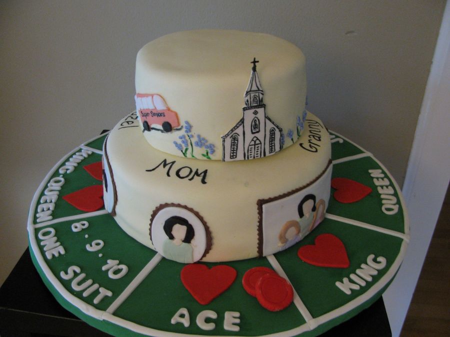 I was given three themes for this cake for a 90th birthday party -- tripoley (base), family (bottom tier) and senior trips to the painted churches (top tier).