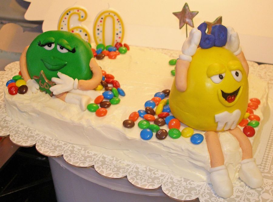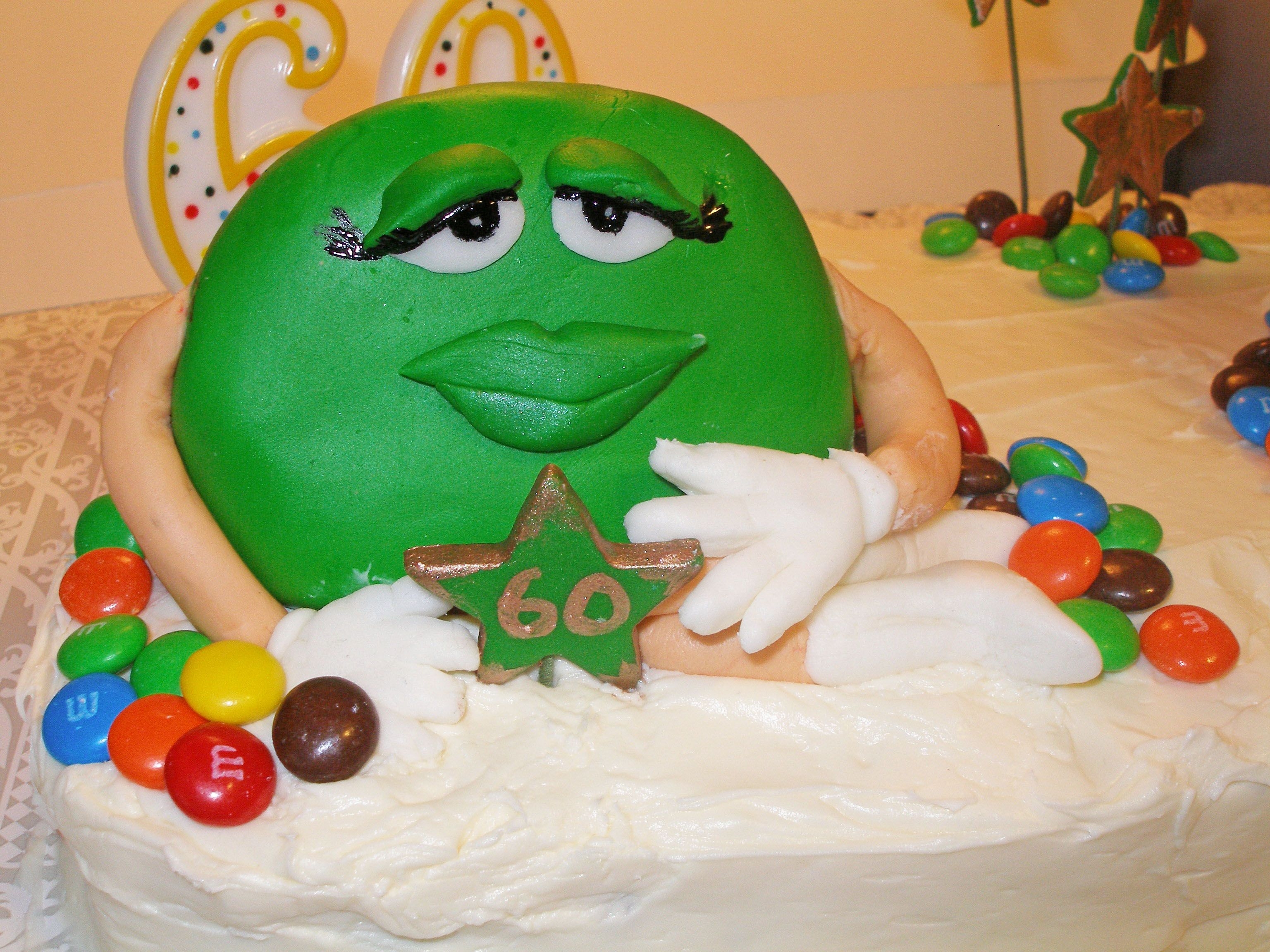 60th Birthday cake for my wonderful mother-in-law. The M&M's are marshmallow fondant on carrot cake with creamcheese frosting, her favorite