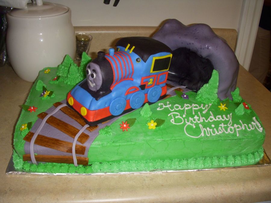 Thomas is sculpted out of cake and covered in fondant, as is the mountain behind him. The cake itself is BC w/ mostly fondant accents, aside from the BC grass and trees