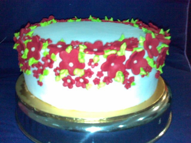 another butter cake, filled with buttercream & strawberry jam. YUM! YUM! made this for my mum on her birthday. frosted in buttercream & fondant flowers. my 1st time using flower puncher (4 sizes). Thank you for looking. sorry for the bad picture, taken with a camera phone.