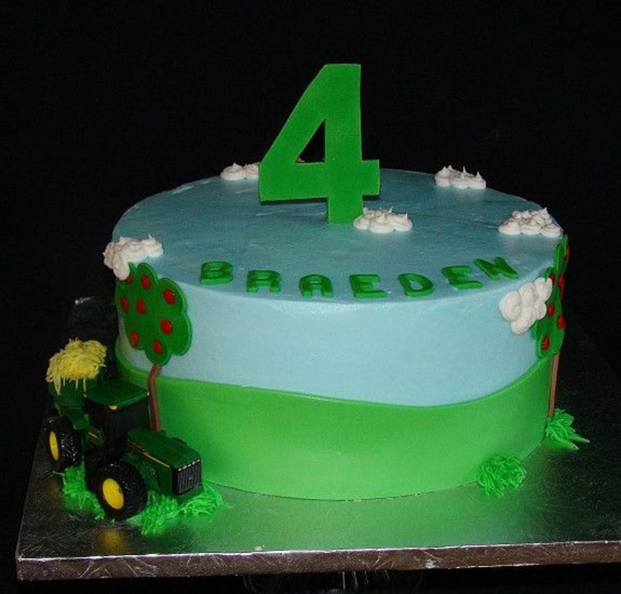 Double layer 10" round. Covered in buttercream with MMF accents. 4 is gumpaste. Metal tractor.
