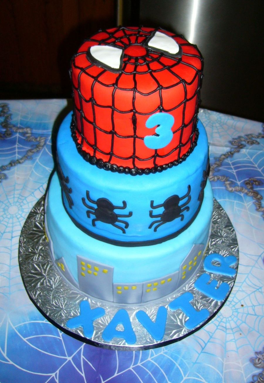Chocolate and vanilla cake layered with chocolate and vanilla buttercream with chocolate chips. All MFF fondant decorations except the web, which is buttercream. For a superhero party for my neighbor.