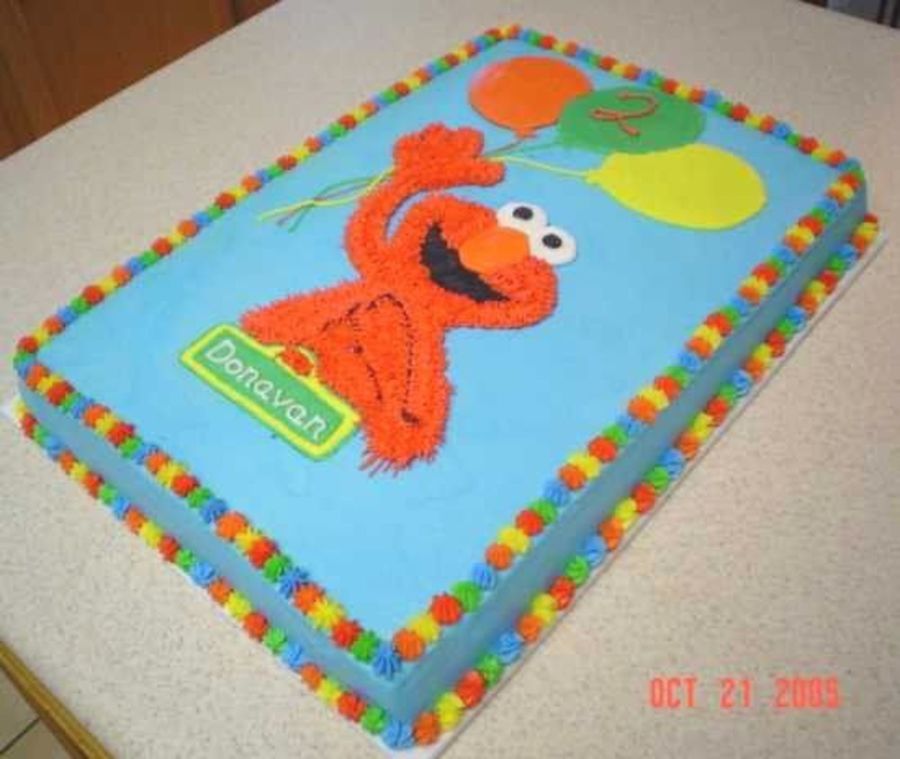 That is absolutely amazing! The blue icing is smooth, the balloons are perfect too. Love the idea of putting his name in the Sesame Street license plate too. Elmo is great! The border is so awesome. Great idea!