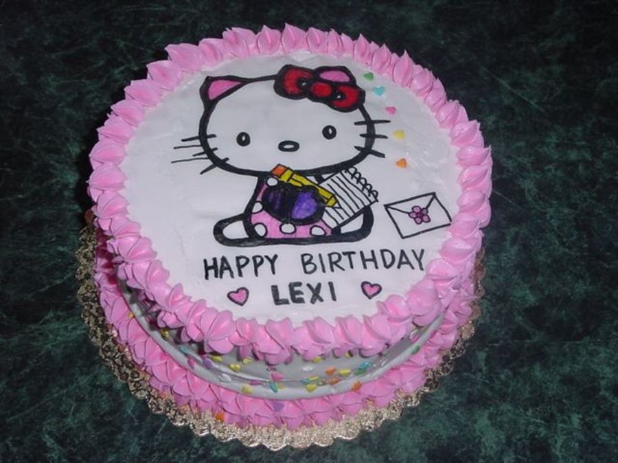 Cake covered with whipped cream and edible paper picture of Hello Kitty