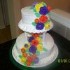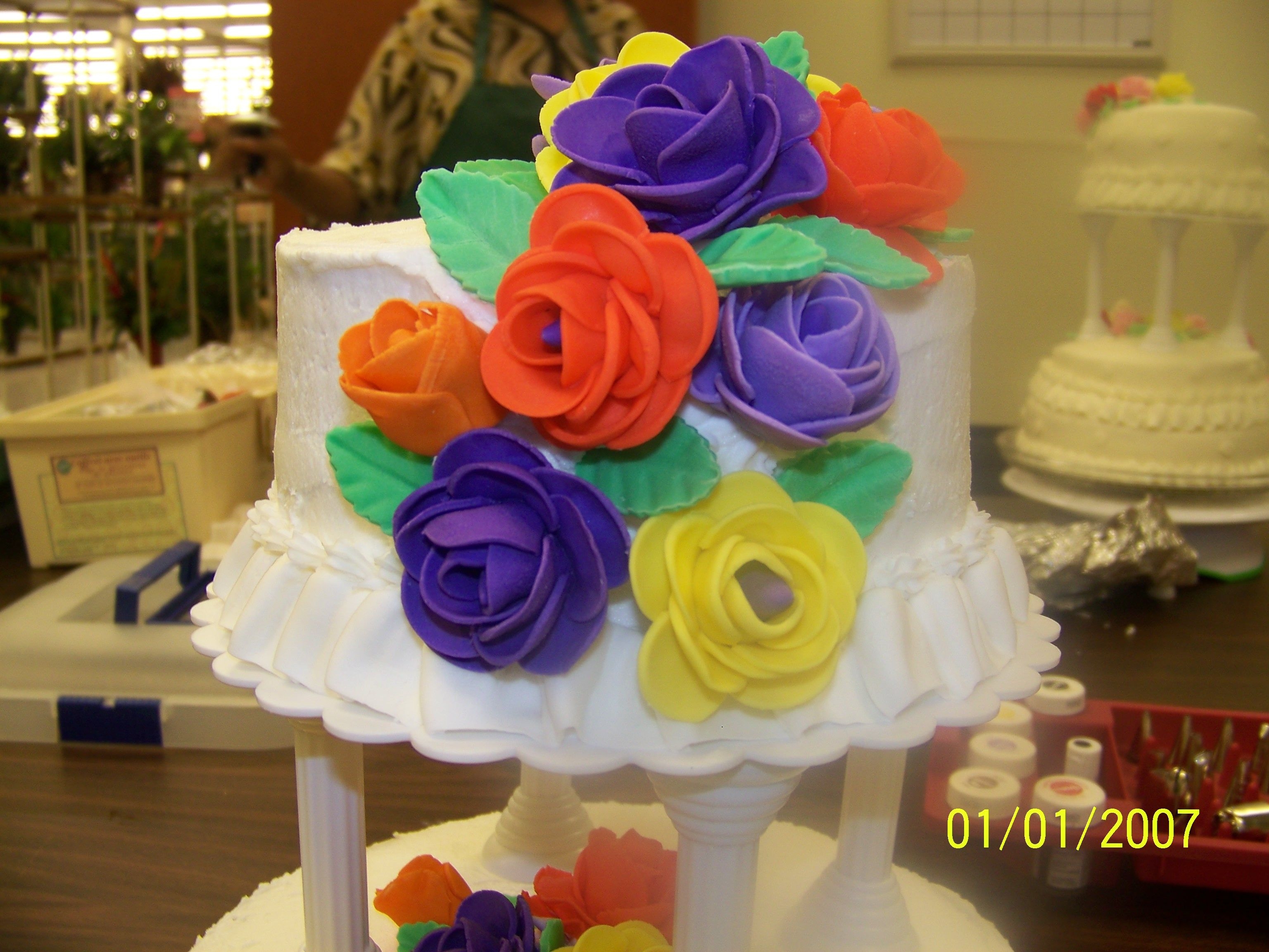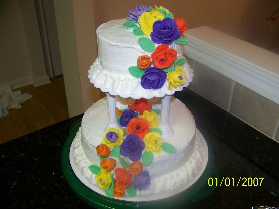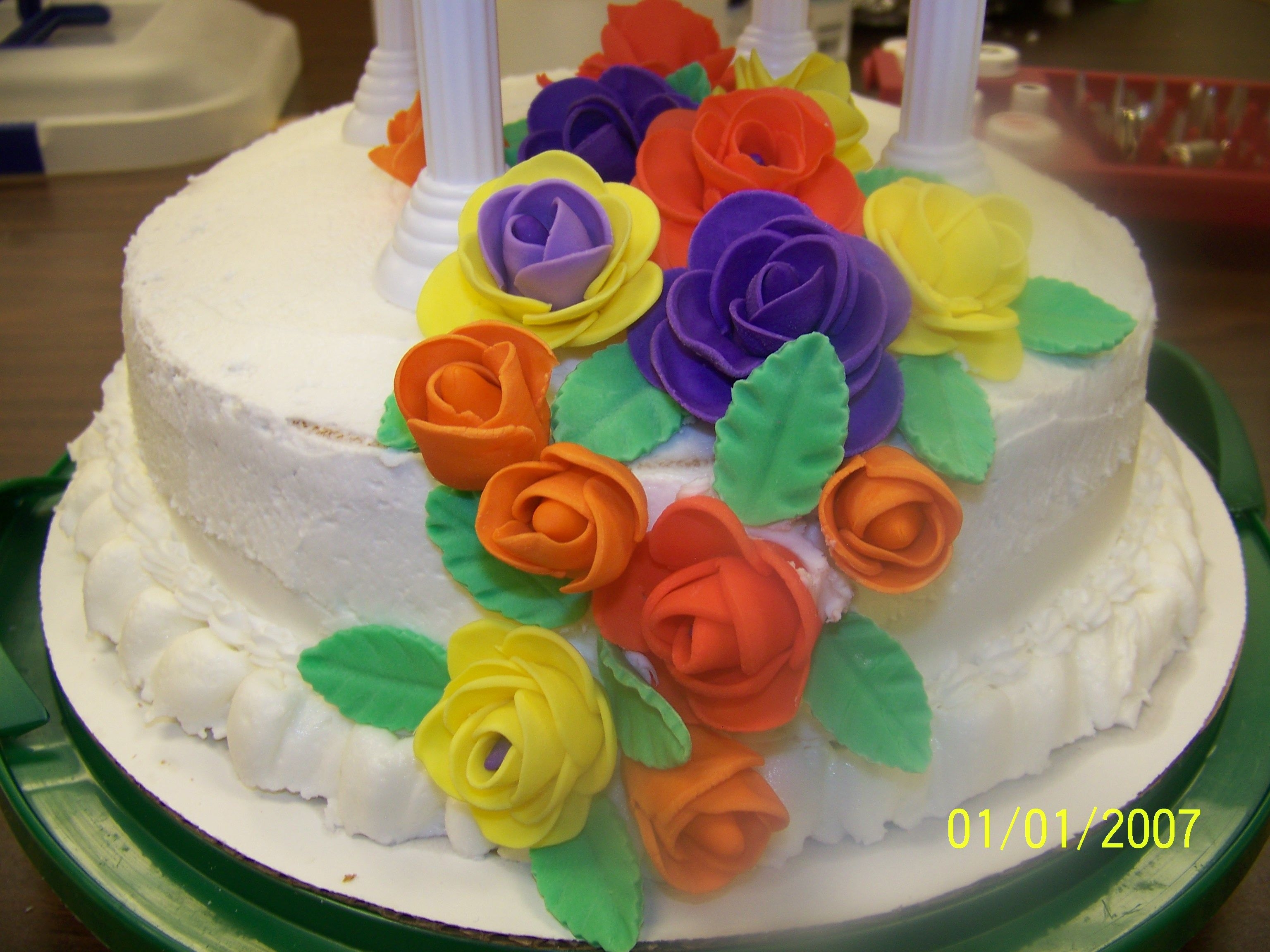Had all of these colorful roses because I wanted to use up the entire pack of fondant that I bought. Top layer of cake is a rice krispie treat shaped in a 6 inch pan. Bottom was an eggless WASC.