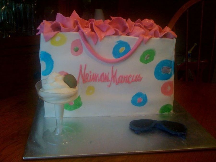 Neiman Marcus shopping bag with a icing martini and fondant olive, and fondant sunglasses.