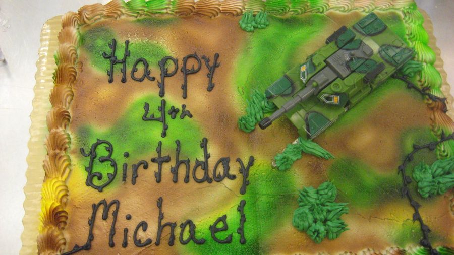 quster sheet, buttercream, camo was airbrushed, barb wire was done with a number 4 writer tip