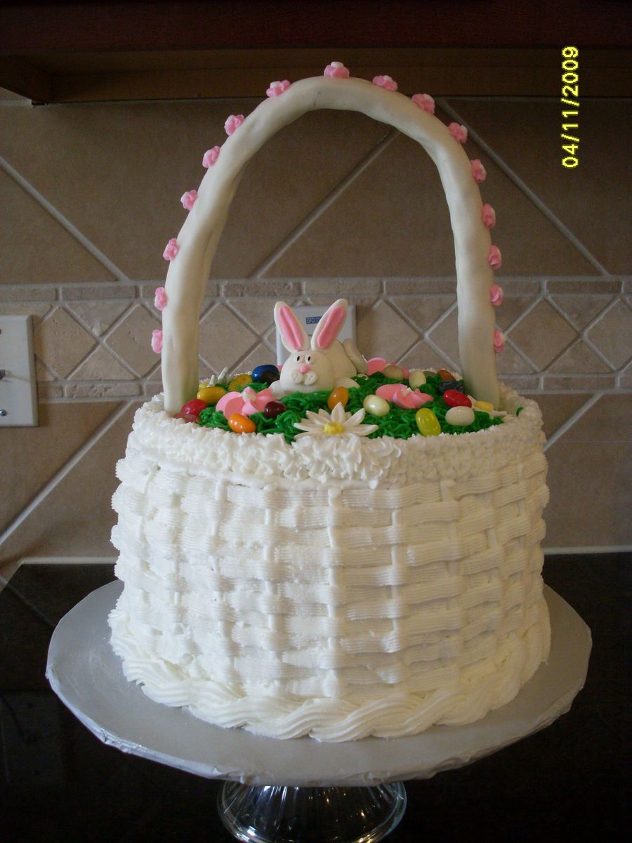 Cake covered in buttercream. Basket handle is aluminum foil covered in MMF. Bunny is gumpaste and eggs are jellybeans.