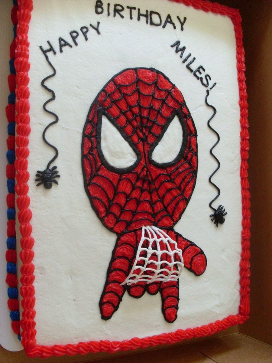Cake covered in buttercream. Spiderman is buttercream free hand design. Web is royal icing.