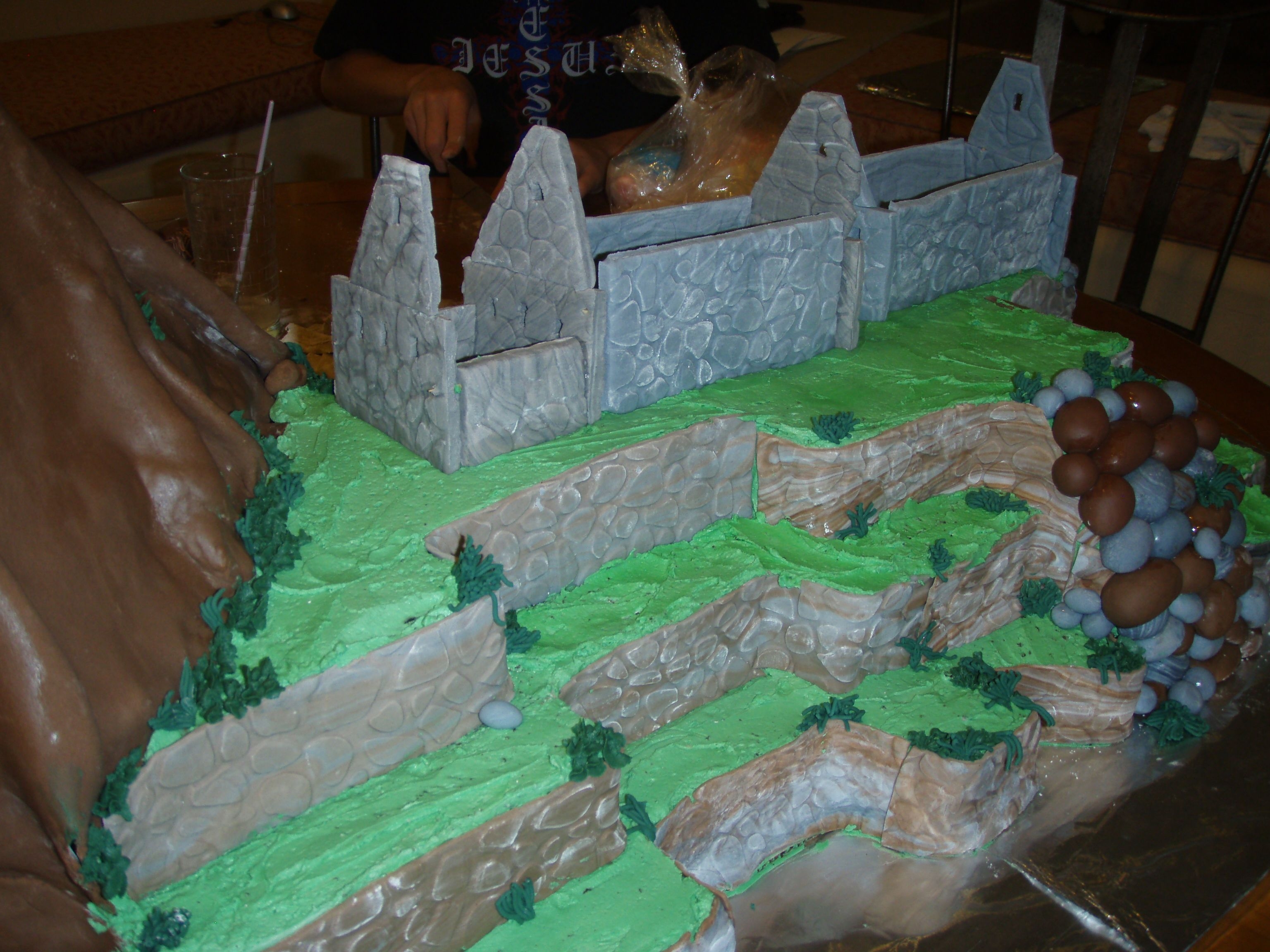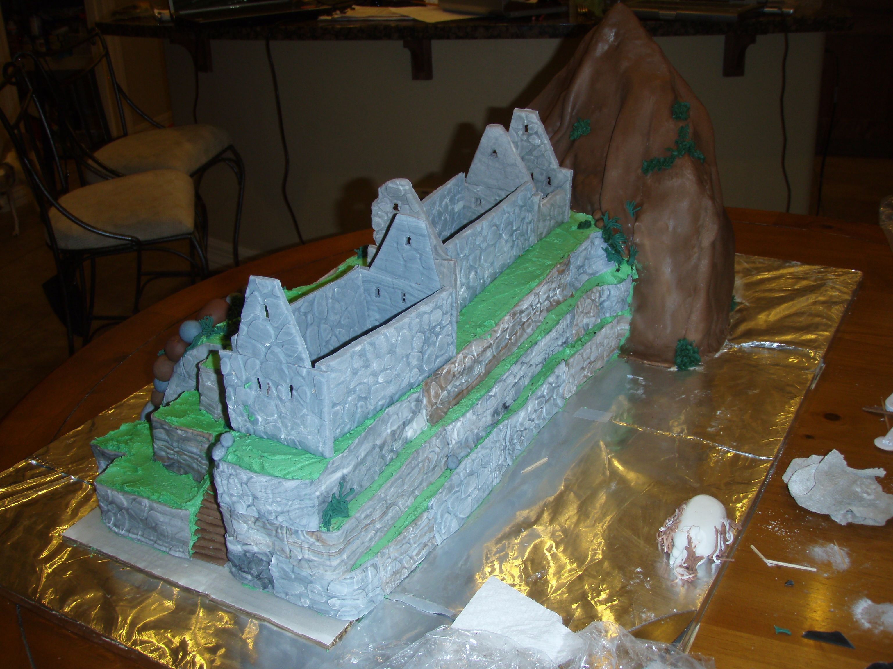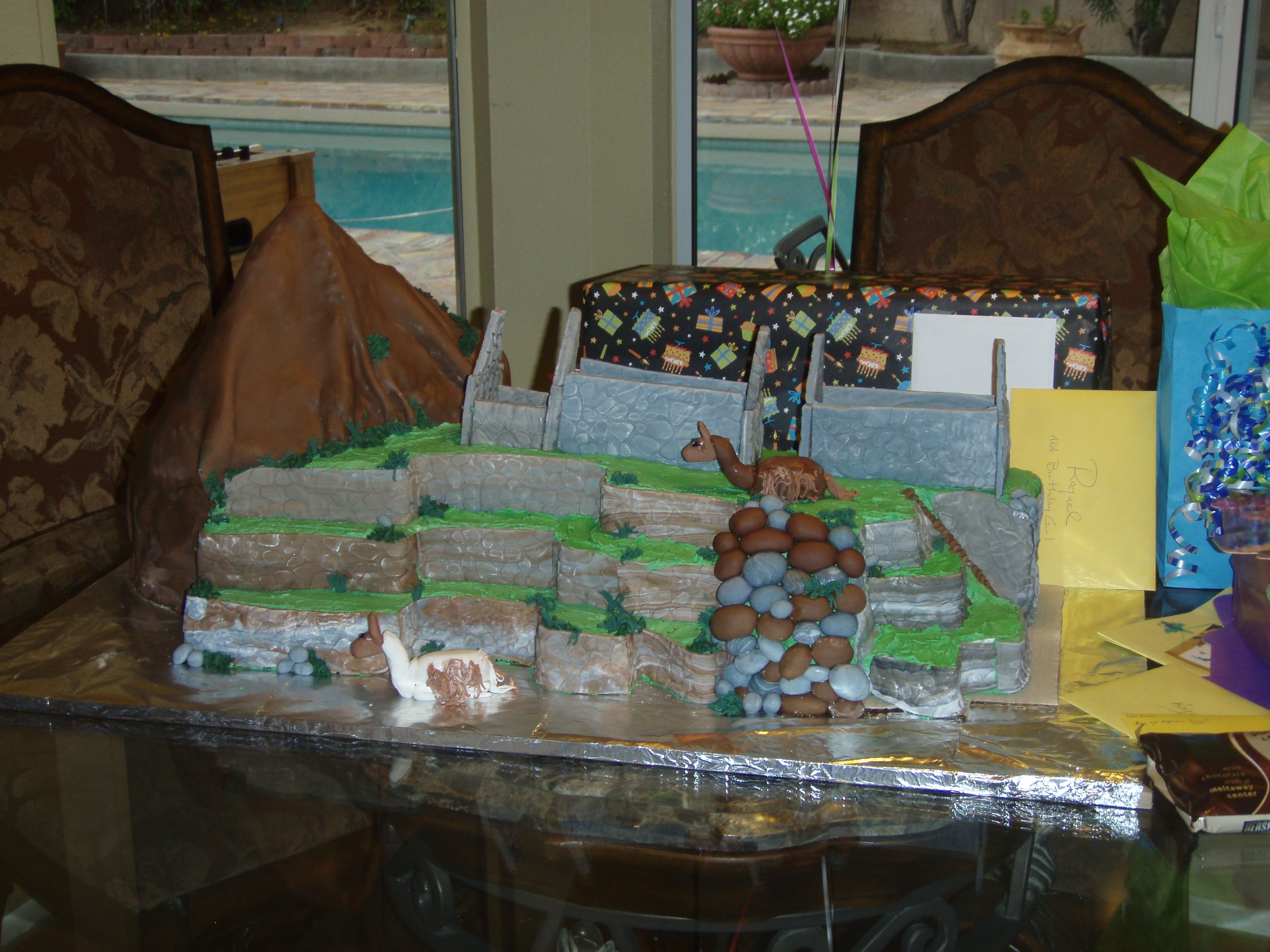 I probably bit off more than I could chew for my third cake ever, but my best friend is from Peru, and I had to surprise her with Machu Picchu when she asked for a cake for her birthday. My buttercream totally flopped, so I didn't get to decorate the mountain or the grass like I wanted to. Chocolate cake on the left, Rum cake on the right. Mountain is RKT. Buttercream and fondant.