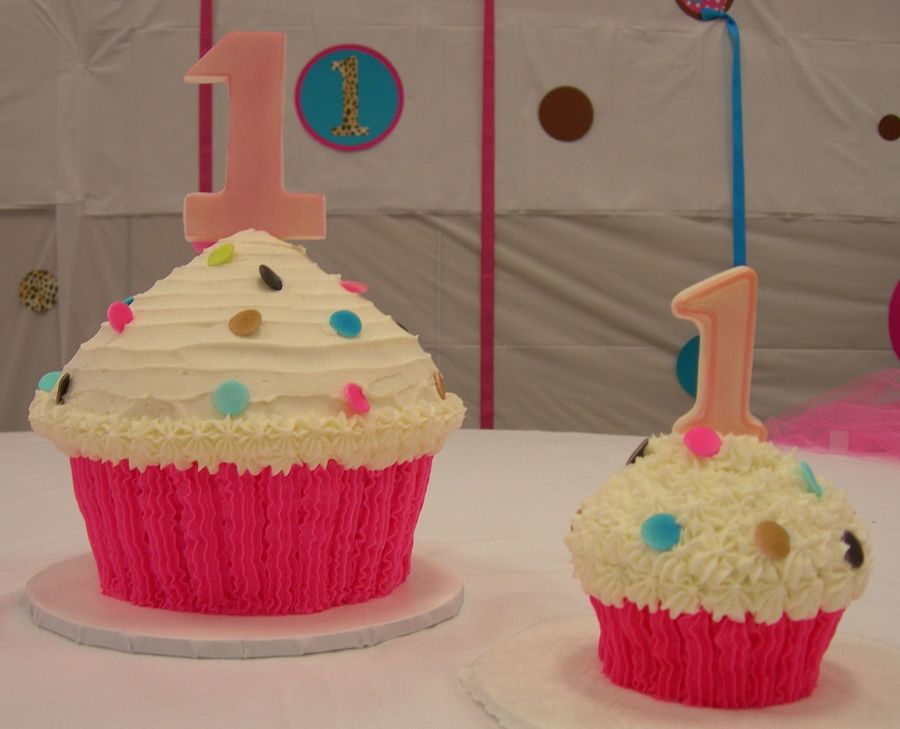 These were made from the Wilton Giant Cupcake pan and the cupcake pan with 4 medium cupcakes. All white with buttercream. Fondant dots and the 1's were white chocolate mint. TFL!