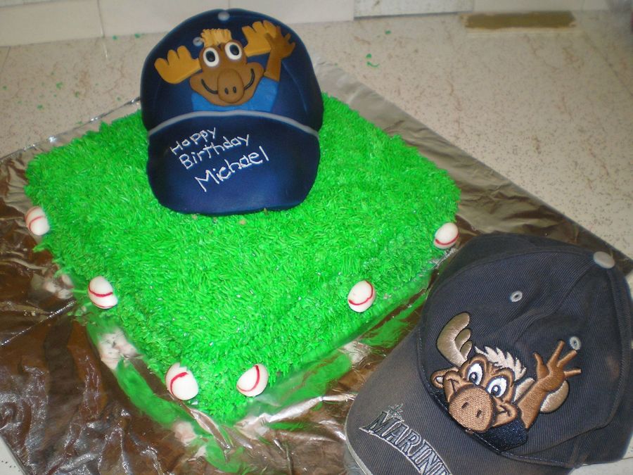 This cake was made to be a replica of my son's favorite baseball hat from the Seattle Mariners.