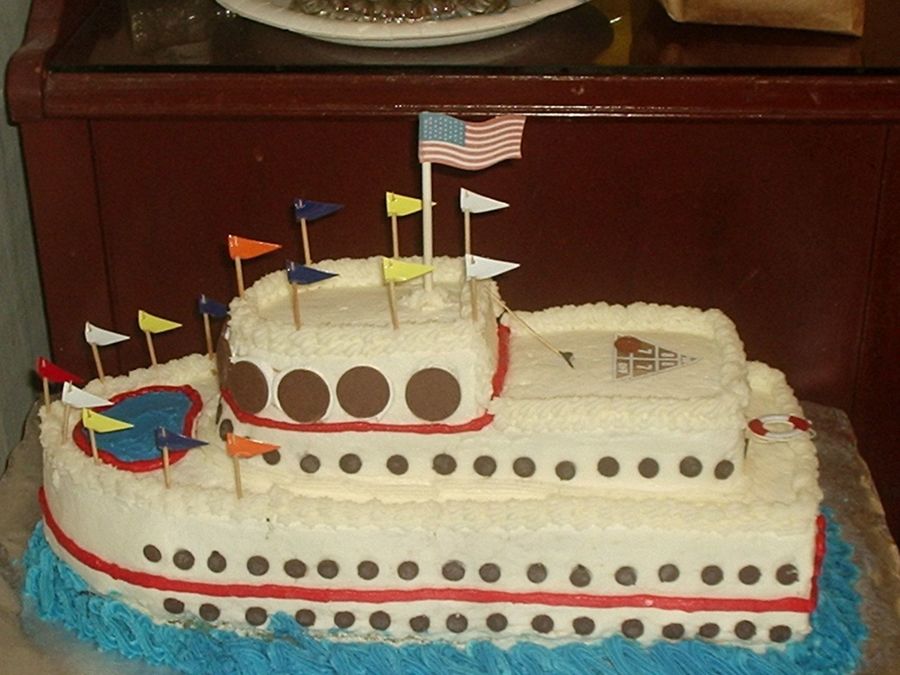 mother in laws 86th birthday ! white cake with buttercream , choc chips for windows flags ,shuffle board , and life preserver are scrapbook stickers.