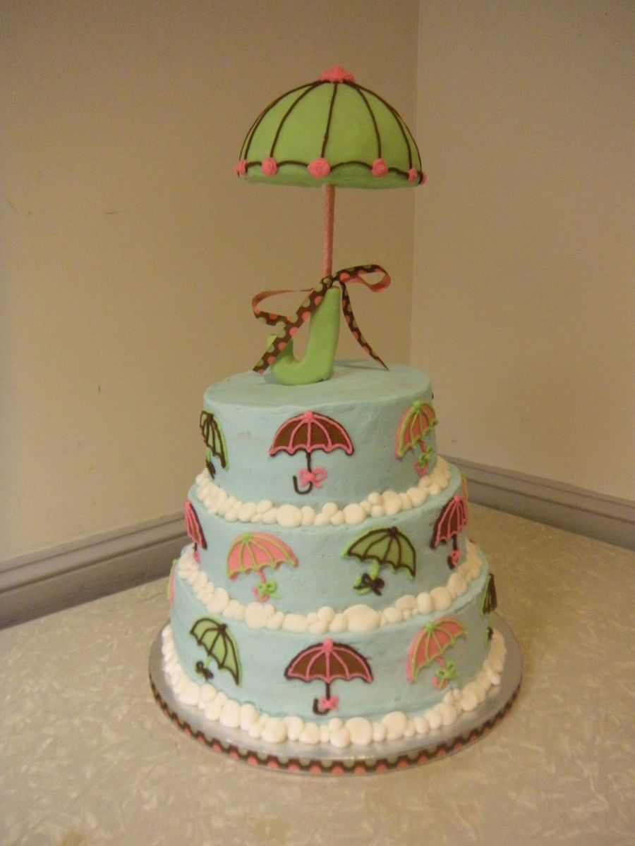 This cake was made for a baby shower but would also work as a bridal shower cake. Umbrella was made by covering half a styrofoam ball in fondant.