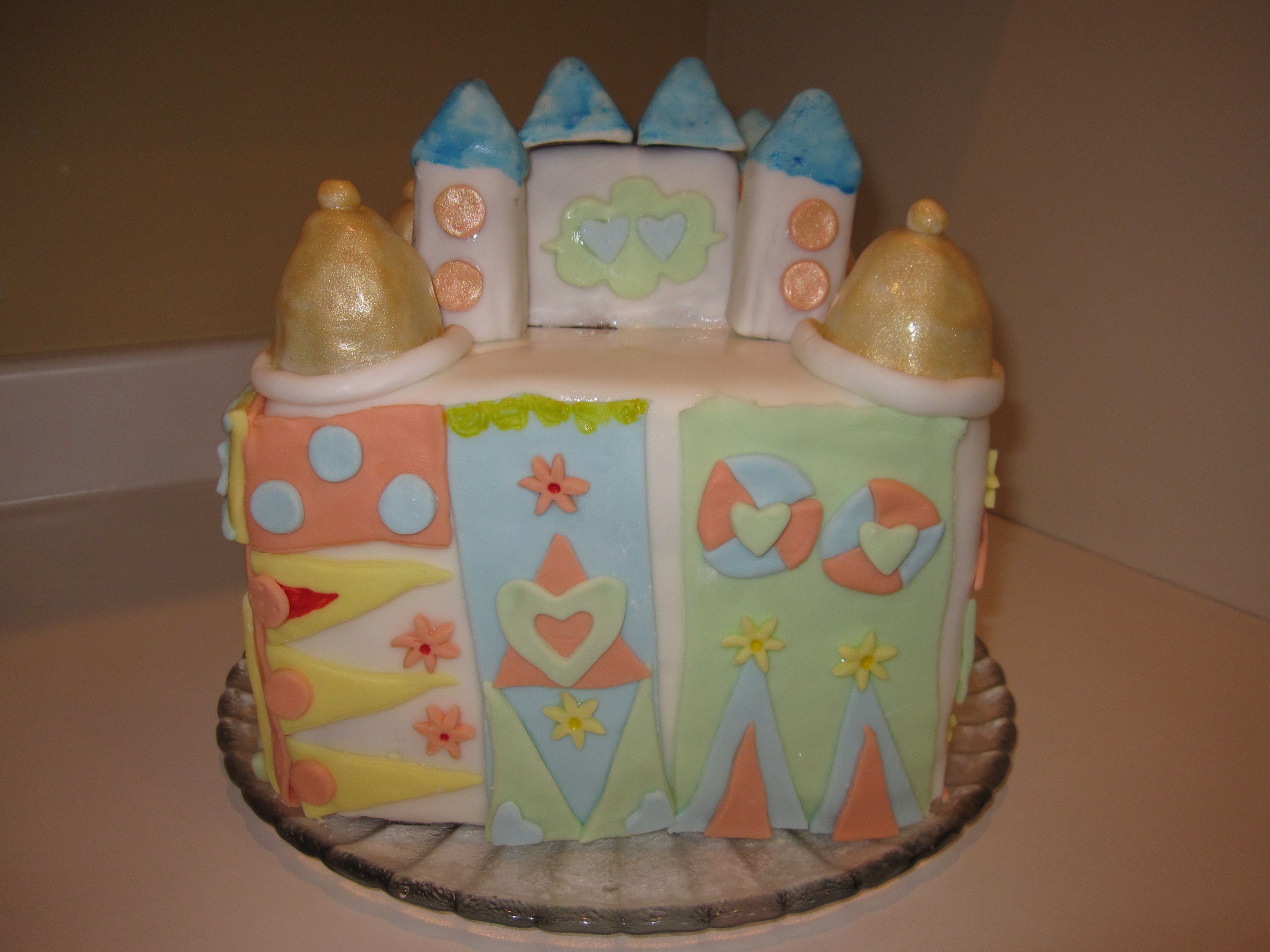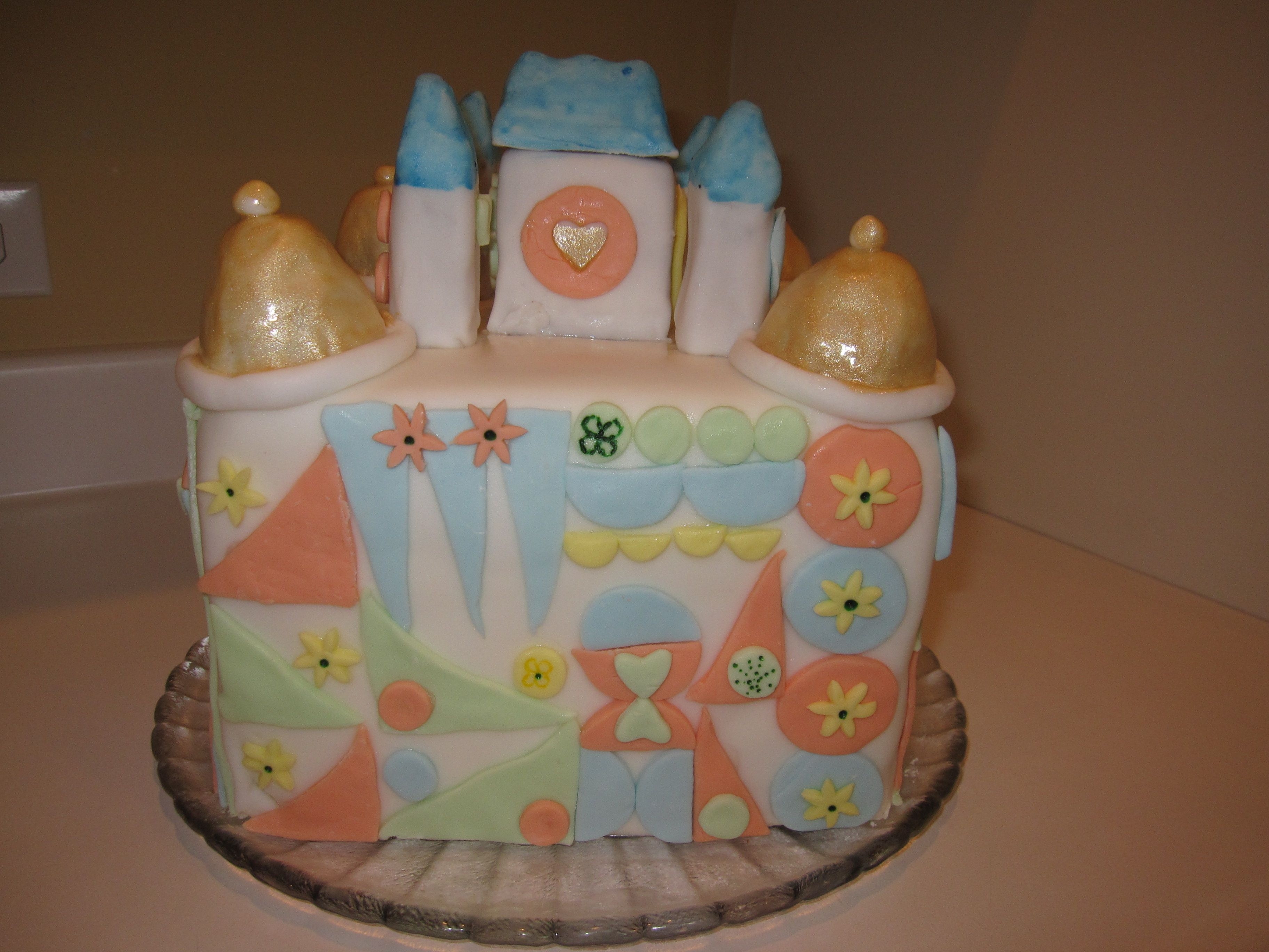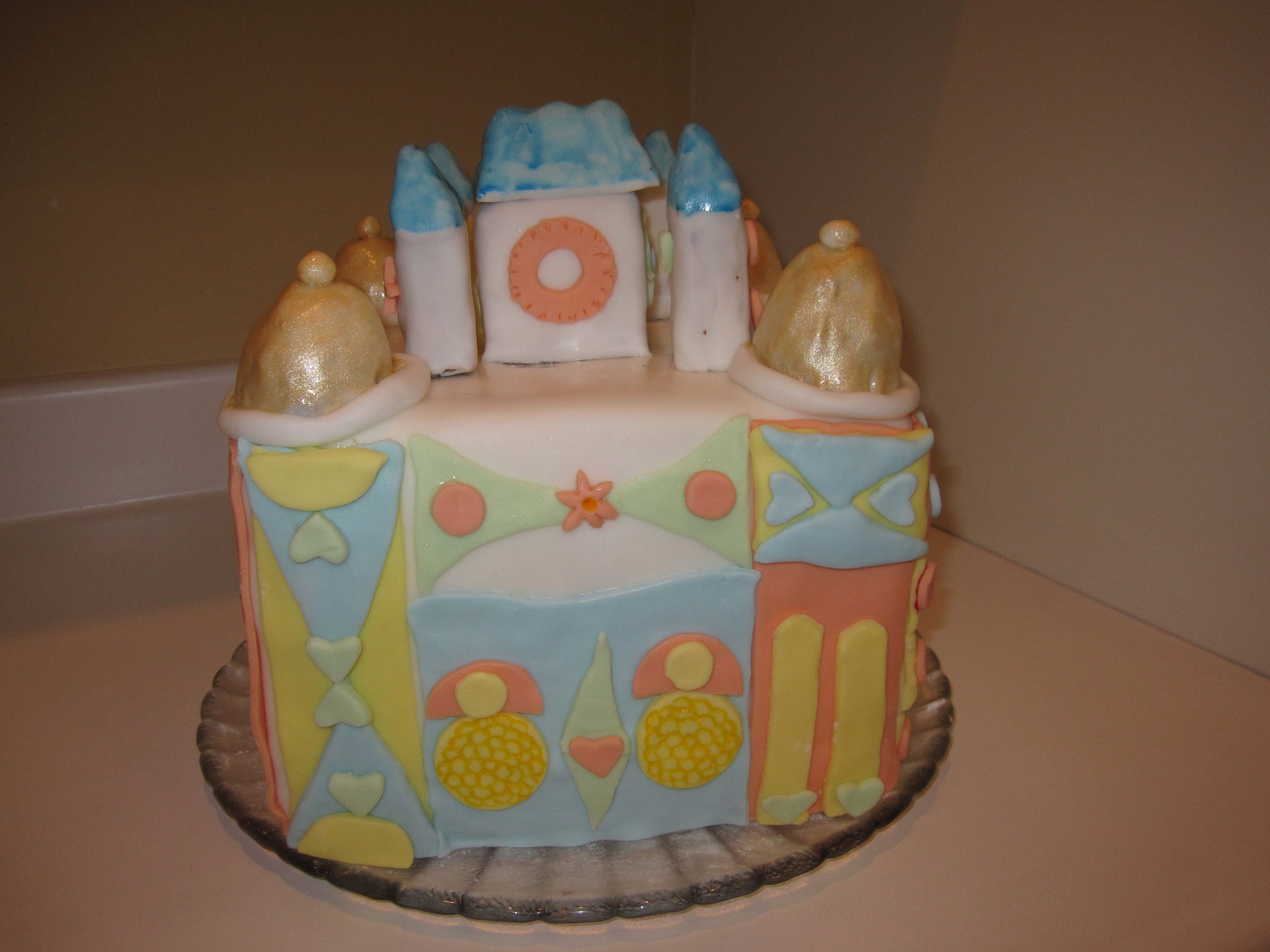 I made this cake for a friends birthday. Its a copy of the building that contains the Its a small world ride in Disneyland, CA.