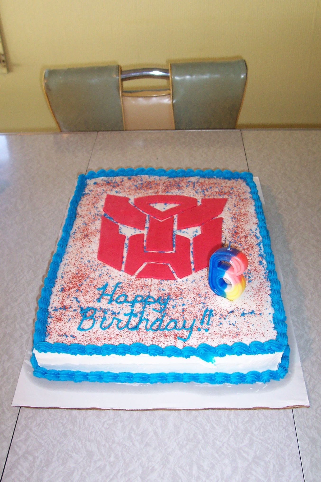 This was for my sons 6th birthday. Just the way that he wanted it. Everything is edible...buttercream frosting and fondant for the Autobot symbol.